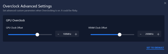 Para ampliar ainda mais sua experiência, o Vantage também oferece overclocking de GPU integrado que permite ajustar o clock da GPU e o deslocamento de VRAM para extrair um pouco mais de energia deles. No entanto, esteja avisado de que a Lenovo não se responsabiliza se houver algum dano ao seu laptop.