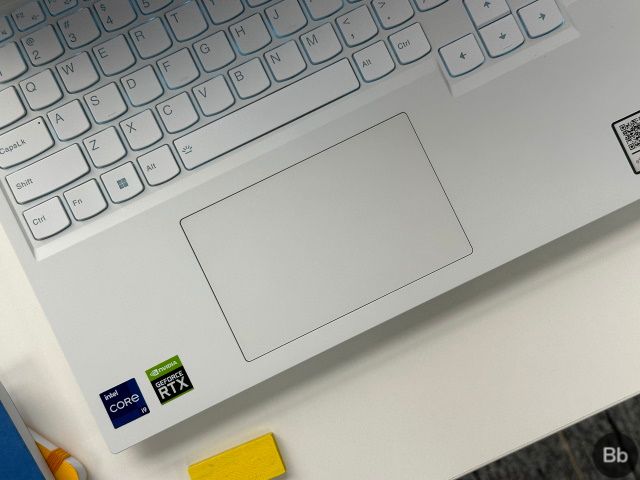 O Lenovo Legion 5i Pro vem com um teclado de tamanho normal e um teclado numérico dedicado. Nosso modelo branco vem com uma luz de fundo azul, mas o Legion oferece uma variante RGB completa de 4 zonas. O teclado está emparelhado com um grande trackpad que se desvia um pouco para a esquerda devido ao espaço ocupado pelas teclas de seta.