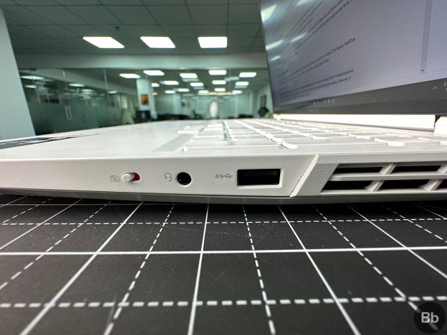 O lado direito do laptop tem um 3.2 Gen 1 USB-A, um fone de ouvido/microfone de 3,5 mm junto com um físico strong> obturador da câmera que fica vermelho quando está ligado. No entanto, isso não é tudo.