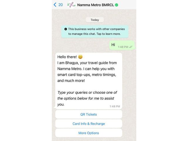 O WhatsApp fez uma parceria com a Bangalore Metro Rail Corporation Limited (BMRCL) para o novo serviço de emissão de bilhetes QR baseado em chatbot para o metrô Namma. A BMRCL tornou-se oficialmente a primeira a introduzir um serviço de emissão de bilhetes QR de ponta a ponta no WhatsApp.