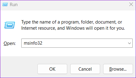 Etapa 2: Digite msinfo32 no campo Abrir e pressione Enter. Isso abrirá o aplicativo Informações do sistema.