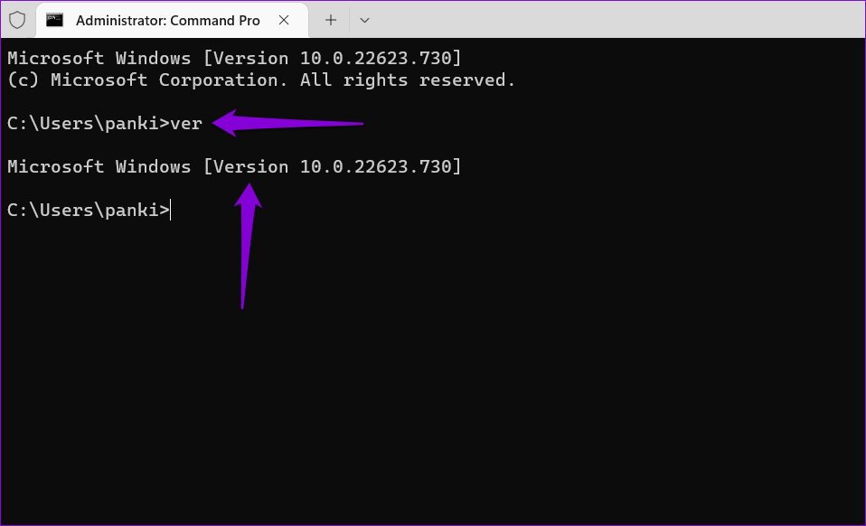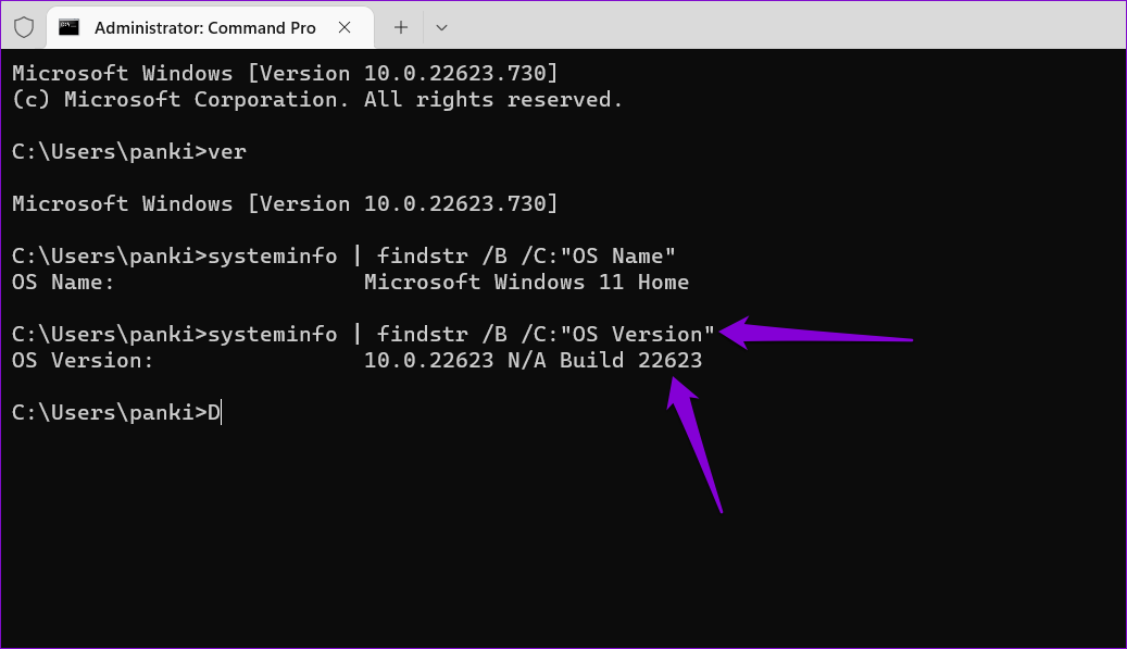 Etapa 5: Cole o seguinte comando e pressione Enter para ver o número da compilação.