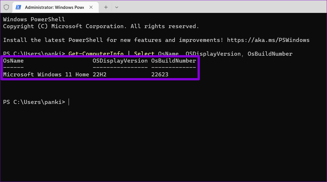 Get-ComputerInfo | Selecione OsName, OSDisplayVersion, OsBuildNumber