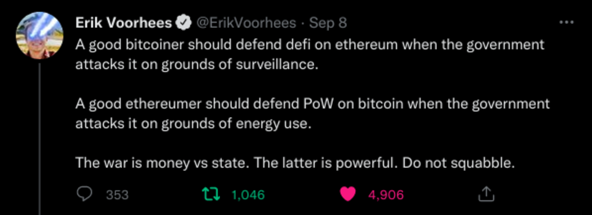 Tweet de Erik Vorhees sobre a sanção de Tornado Cash e possível regulamentação do BTC pelos proponentes do ESG.