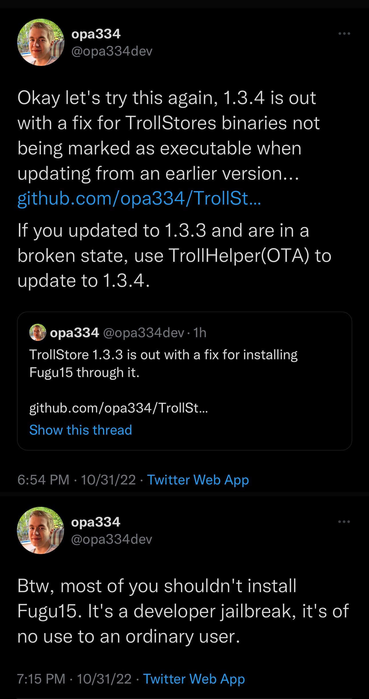 Após o lançamento do jailbreak Fugu15 centrado no desenvolvedor de Linus Henze para dispositivos arm64e executando iOS 15.0-15.4.1, o desenvolvedor iOS opa334 lançou duas atualizações subsequentes para TrollStore para corrigir um problema com a instalação do jailbreak Fugu15 através do popular utilitário de assinatura perma. A primeira atualização foi marcada como versão 1.3.3, enquanto a segunda foi marcada como versão 1.3.4.