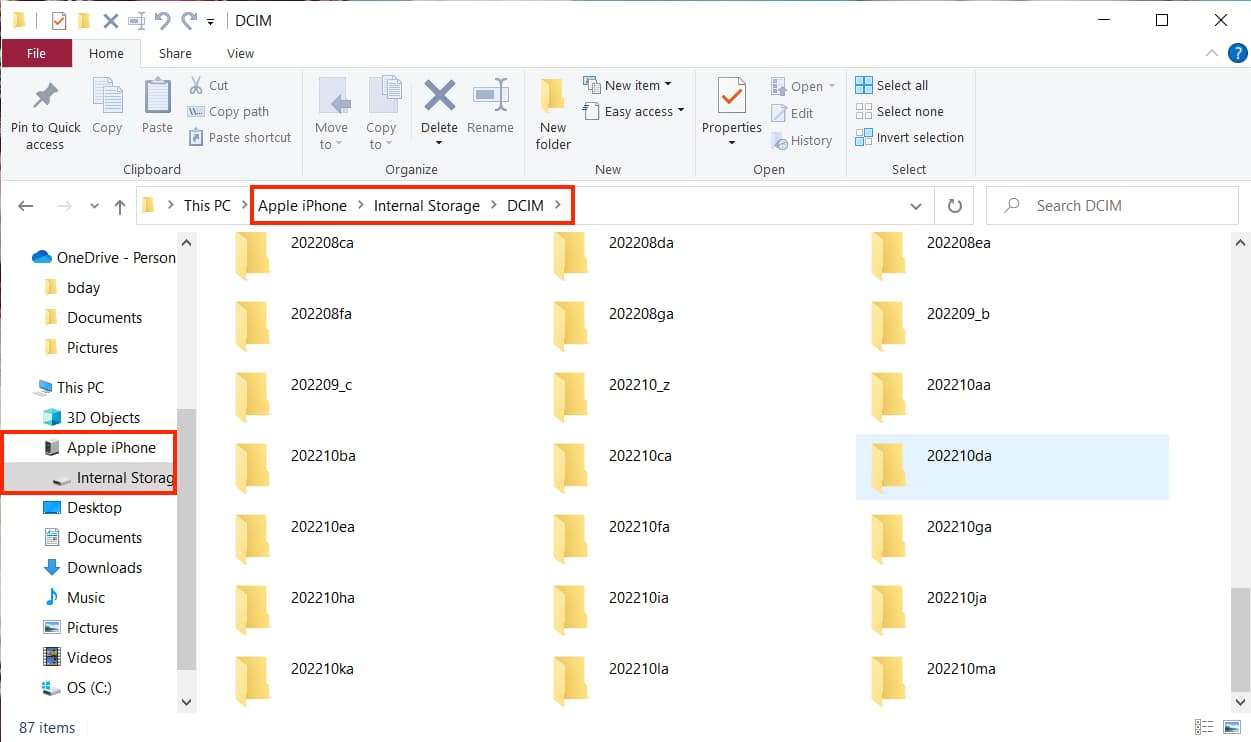 5) Você verá muitas subpastas aqui. Eles têm as imagens do seu iPhone ou iPad. Você pode copiar os arquivos daqui e salvá-los em seu PC com Windows. Para selecionar vários arquivos, mantenha pressionada a tecla Ctrl e clique nas fotos ou vídeos. Você pode pular a cópia de arquivos AAE. Os arquivos AAE contêm os parâmetros de edição das imagens que você editou no seu iPhone.