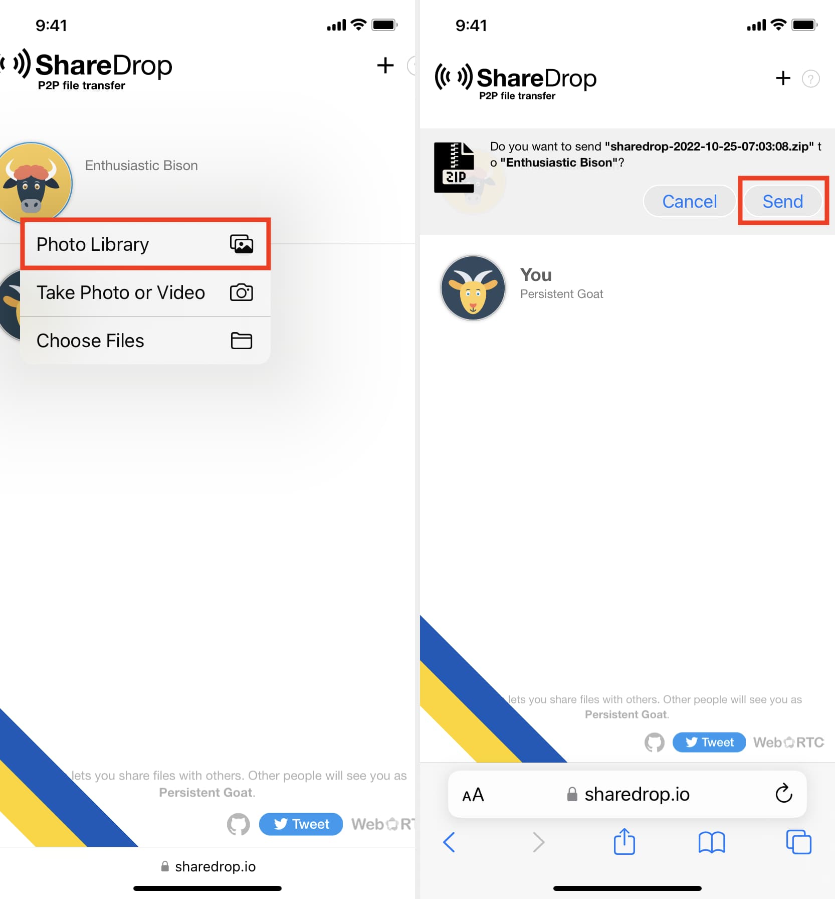 4) Agora toque no apelido do telefone Android na tela ShareDrop dentro do iPhone Safari e escolha Biblioteca de fotos.