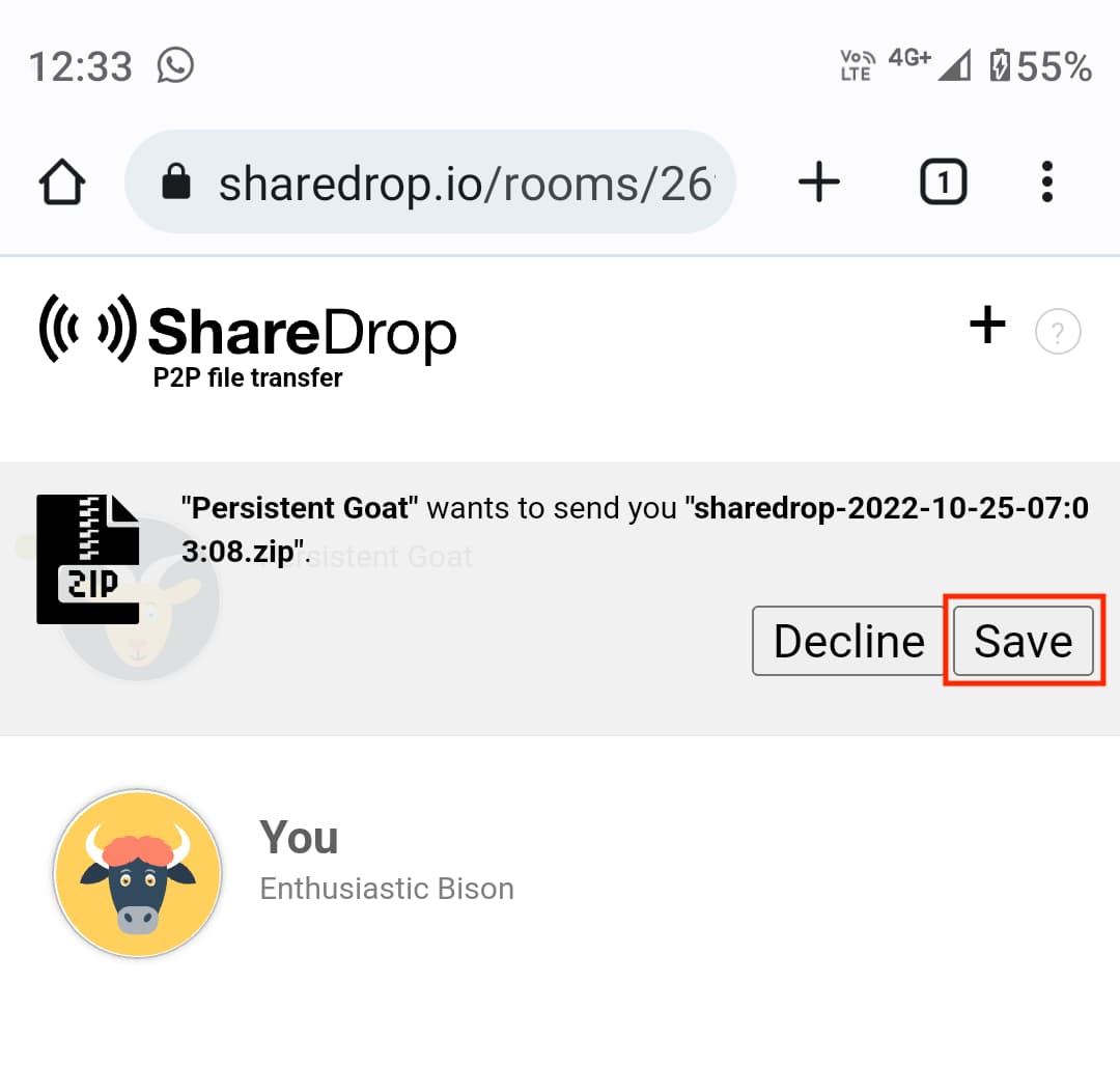 7) Por fim, toque em Salvar na tela ShareDrop do telefone Android para receber os arquivos recebidos. Todas as fotos e vídeos selecionados serão enviados para o telefone Android. Você pode vê-los no aplicativo Android Files ou no aplicativo de galeria.