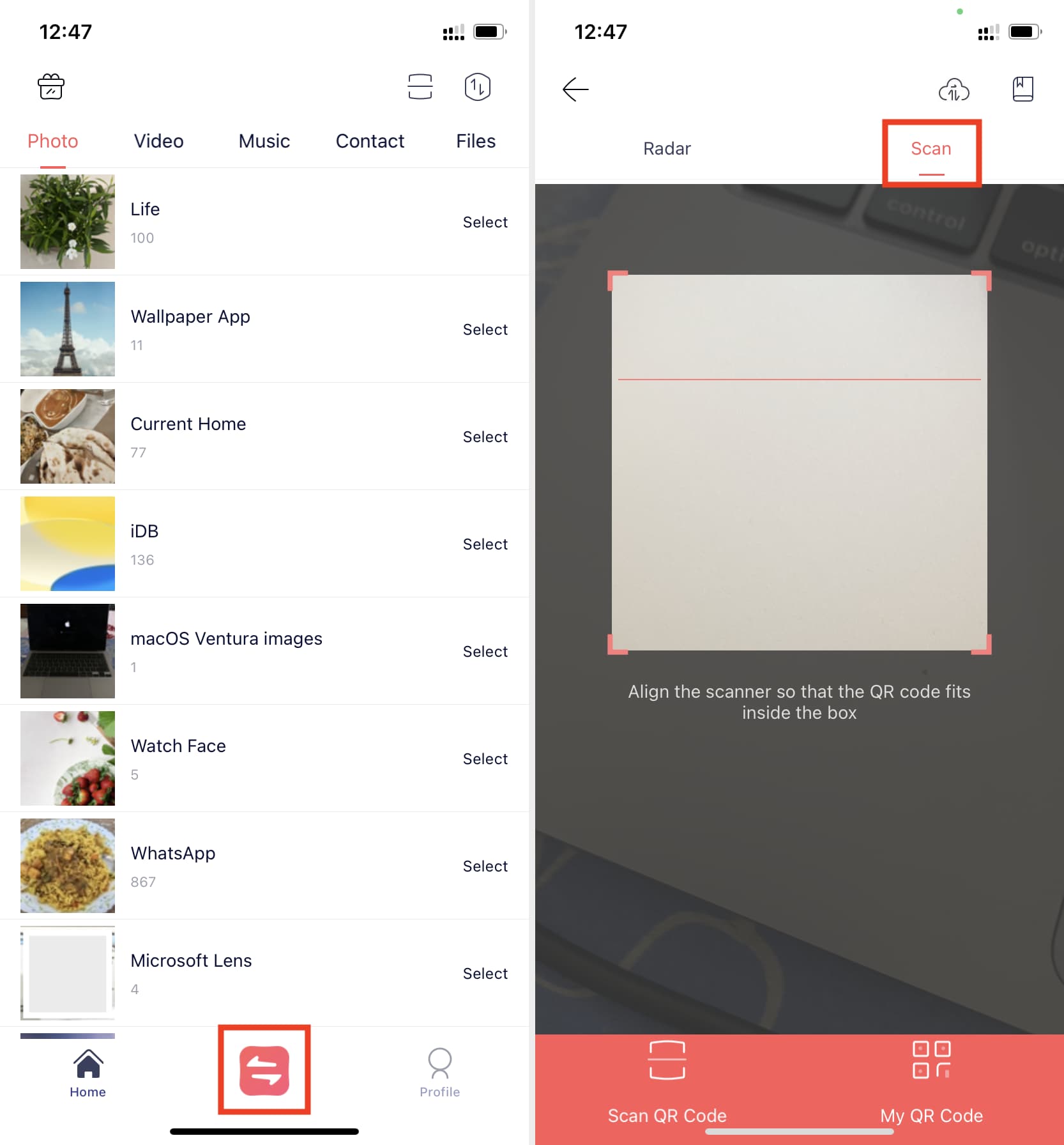 3) Quando estiver dentro do aplicativo Zapya em seu iPhone e telefones Android , toque no botão de seta vermelha na parte inferior central da tela em ambos os telefones.