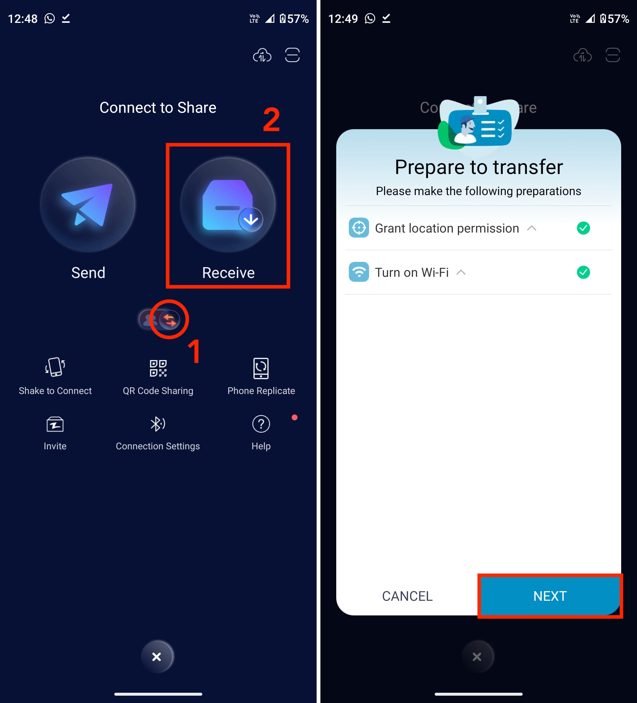 5) No telefone Android, toque no pequeno botão de duas setas e depois toque em Receber. Ative o Wi-Fi, se ainda não estiver, e conceda a permissão de localização. Depois disso, você verá um código QR.
