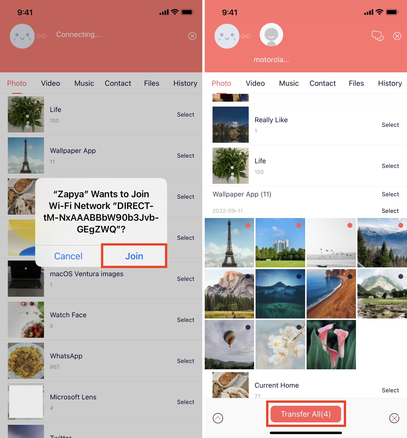6) Digitalize este código QR usando seu iPhone (etapa 4). Depois disso, você verá “Zapya” Quer ingressar na rede Wi-Fi “DIRECT-WD-Random Alphabets”? Toque em Participar. Em segundos, os dois telefones devem se conectar e você ouvirá um tom.