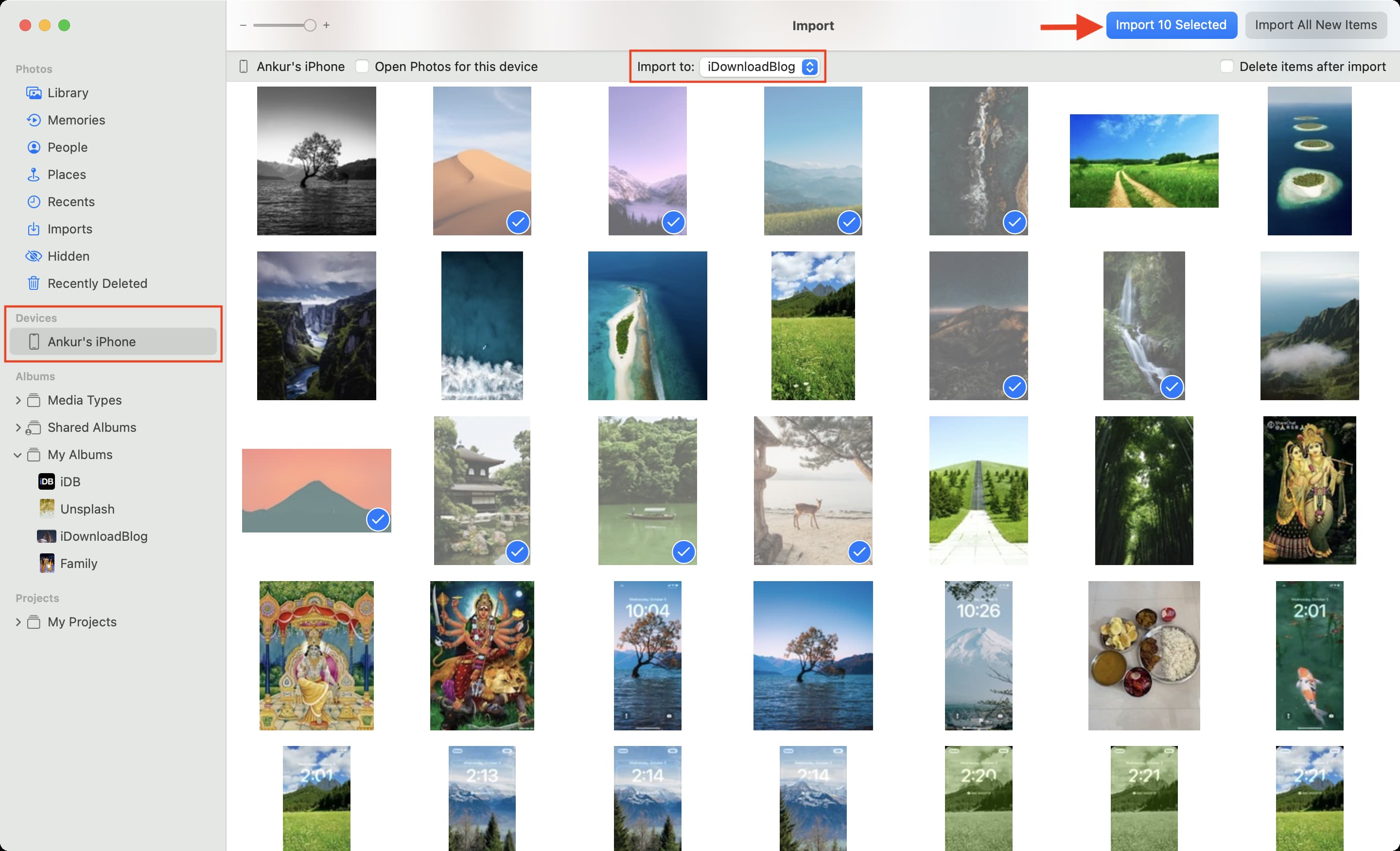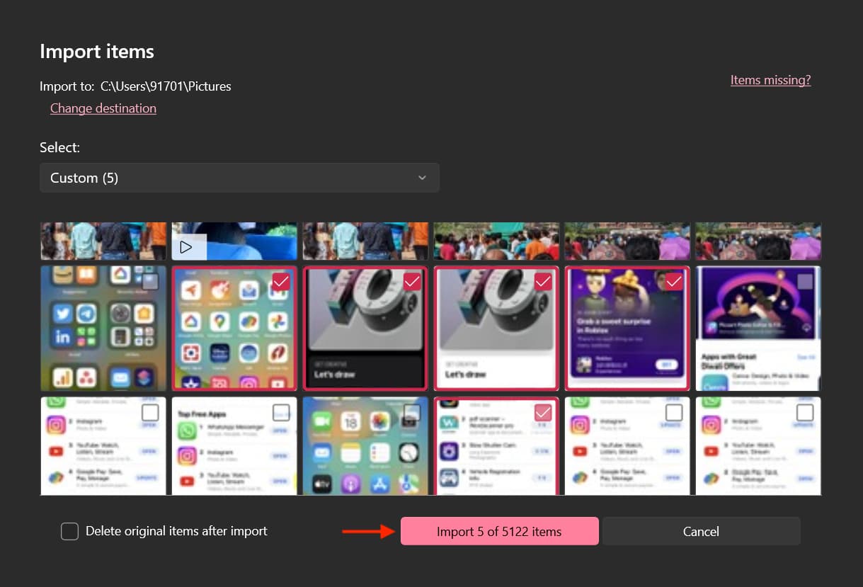 7) Ao terminar a verificação, você verá uma nova janela Importar itens. A partir daqui, observe o destino de importação e, se quiser alterá-lo, clique em Alterar destino e escolha a pasta desejada. Em seguida, selecione suas imagens e vídeos do iPhone e clique em Importar N de itens NN.