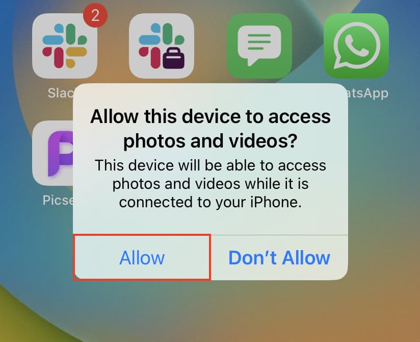 2) Imediatamente após a conexão, você verá um alerta no seu iPhone dizendo:”Permitir que este dispositivo acesse fotos e vídeos ?” Toque em Permitir.