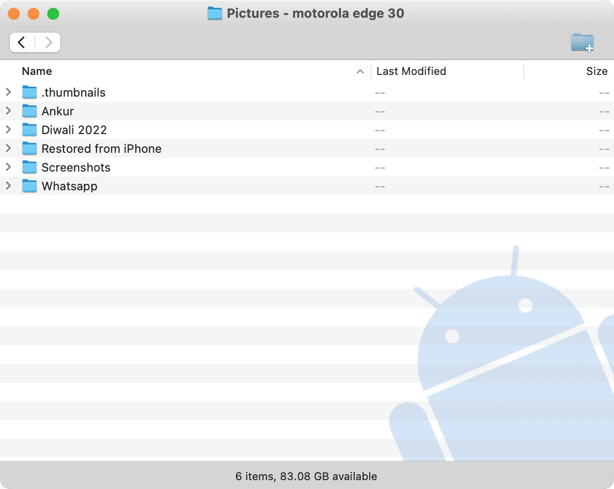 transfira fotos e vídeos do seu iPhone ou iPad para o seu Mac usando um dos métodos mencionados acima. Faça o download e abra o Google aplicativo Android File Transfer no seu Mac. Conecte seu telefone Android ao seu Mac. Você verá um alerta na tela ou na Central de Notificações. Escolha Transferência de arquivos. Depois disso, você deve ver seu telefone Android dentro do aplicativo Android File Transfer. Basta arrastar as fotos e vídeos da pasta Finder do seu Mac para a pasta de armazenamento do telefone Android. Aplicativo Android File Transfer no Mac.