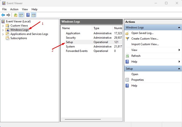 2. No Visualizador de eventos, navegue até o seguinte caminho Logs do Windows > Configuração.