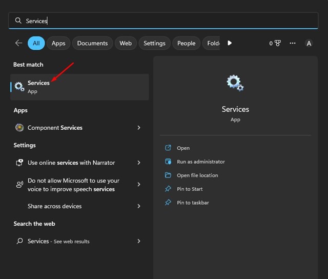 1. Primeiro, clique na pesquisa do Windows e digite Serviços. Em seguida, abra o aplicativo Serviços na lista de opções.