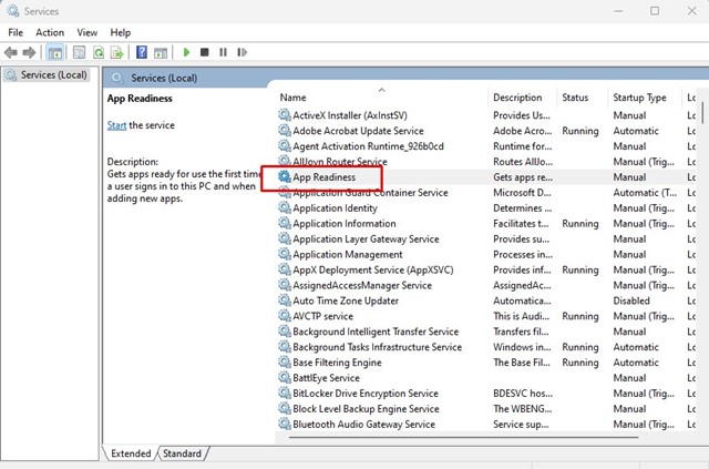 2. Quando o aplicativo de serviços abrir, role para baixo e clique duas vezes em Prontidão do aplicativo.