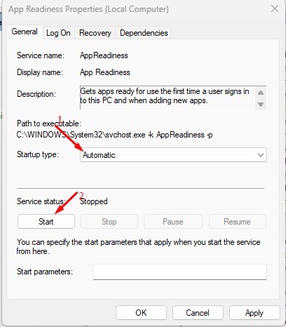 3. Nas App Readiness Properties, selecione ‘Automatic‘ no tipo de inicialização.