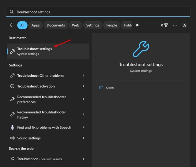 1. Primeiro, clique na pesquisa do Windows e digite Solução de problemas. Em seguida, abra as configurações de solução de problemas na lista de opções disponíveis.