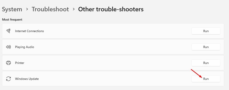 3. Agora, encontre a atualização do Windows e clique no botão Executar ao lado dela.