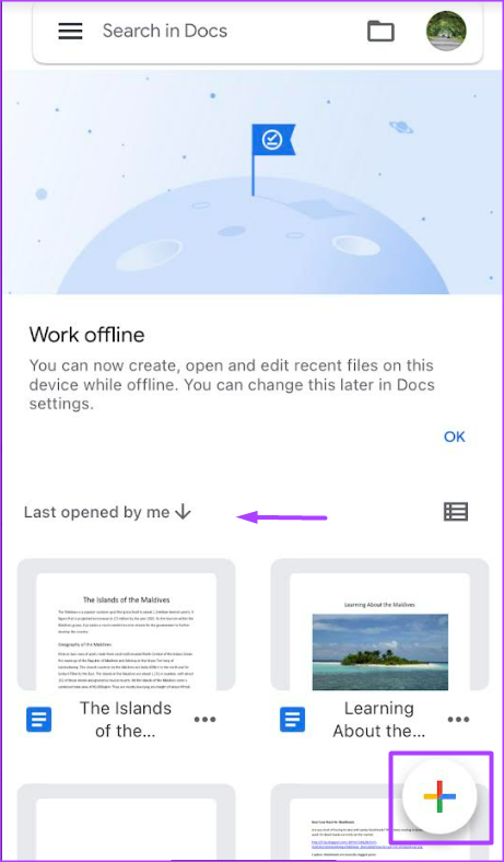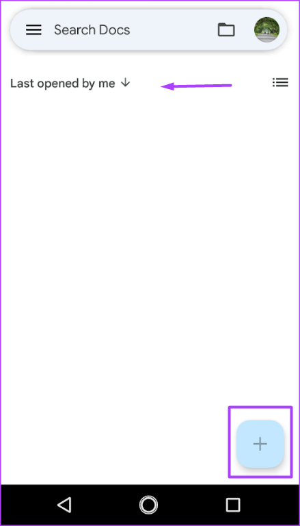 Etapa 2: Para um novo documento, toque no ícone + na parte inferior direito do aplicativo. Caso contrário, se você estiver tentando converter um arquivo já existente no Google Docs para o formato sem página, toque nele em Documentos recentes.