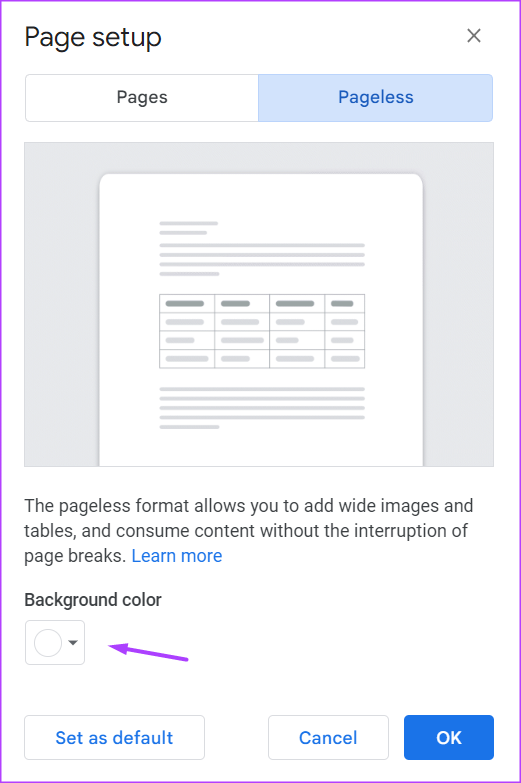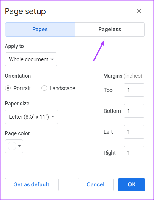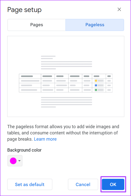 Etapa 7: Se você deseja tornar o formato sem página o layout padrão para seus arquivos do Google Docs, clique em’Definir como padrão’no canto inferior esquerdo.