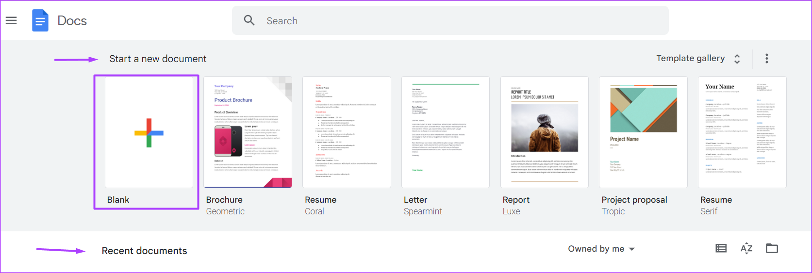 Etapa 2: Se você estiver criando um novo documento, no grupo’Iniciar um novo documento’, clique no modelo em branco. Caso contrário, se você estiver tentando converter um arquivo existente no Google Docs para o formato sem página, clique nele em seus Documentos recentes.