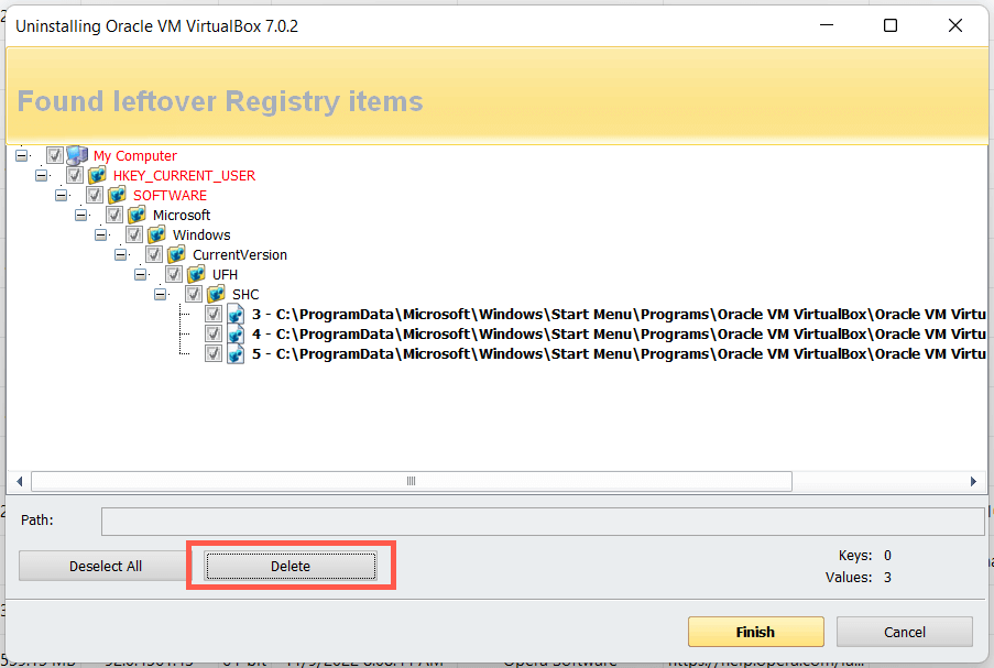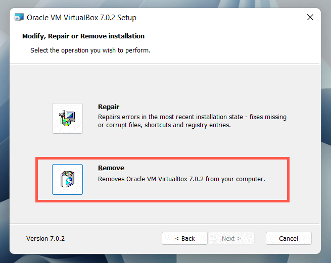 Se o VirtualBox não aparecer no aplicativo Configurações ou no Painel de controle, use o instalador do Virtualbox para remover o programa.