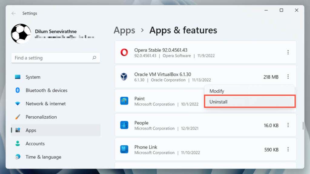A maneira mais direta de desinstalar o Oracle VM VirtualBox é usar o console de Aplicativos e Recursos nas Configurações do Windows.