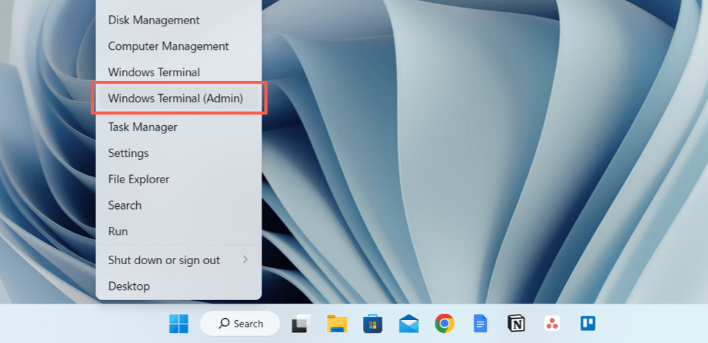 Clique com o botão direito do mouse no botão Iniciar, escolha Windows PowerShell/Terminal (Admin). Selecione Sim no pop-up Controle de conta de usuário.