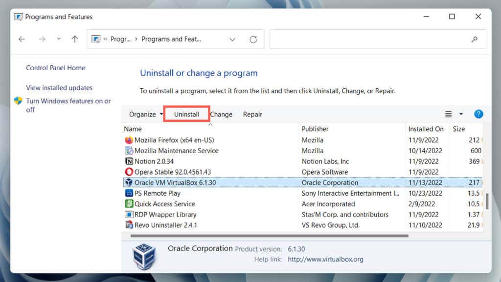 Como alternativa, use o painel Programas e Recursos mais antigo no Painel de Controle do Windows para remover o VirtualBox.