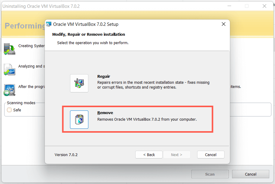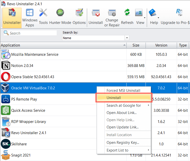 Use um utilitário de remoção de software dedicado para remover o VirtualBox e todas as suas entradas de registro. Por exemplo, aqui está a versão gratuita do Revo Uninstaller em ação.