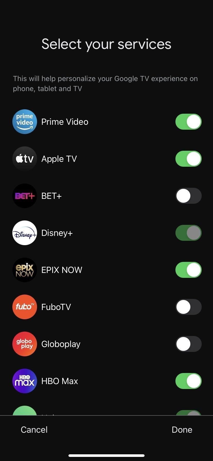 Em seguida, você terá a opção de selecionar quais serviços de streaming deseja que o aplicativo agregue. Você pode pular isso para mais tarde, mas o aplicativo serve como um hub para navegar pelo conteúdo e iniciá-lo no aplicativo apropriado, então você também pode selecionar suas assinaturas agora.