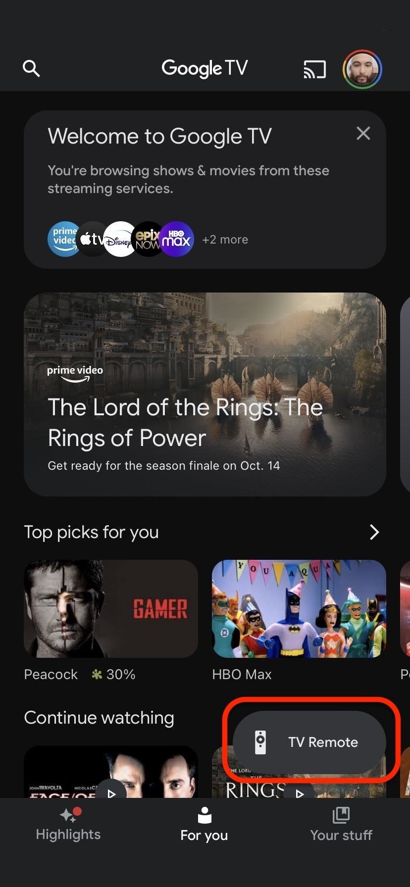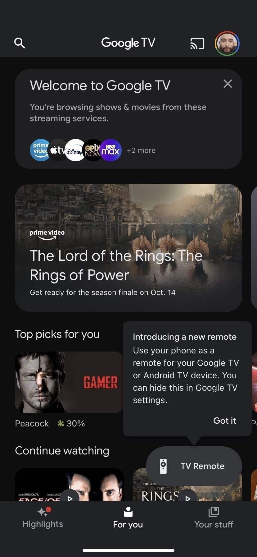 Você encontrará uma caixa de diálogo explicando o novo controle remoto. Toque em”Entendi”para descartar isso e, em seguida, toque no botão”Controle remoto da TV”em qualquer uma das guias. Caso não a veja, toque na foto do seu perfil, escolha”Configurações do Google TV”e verifique se a opção”Usar telefone como controle remoto”está ativada.