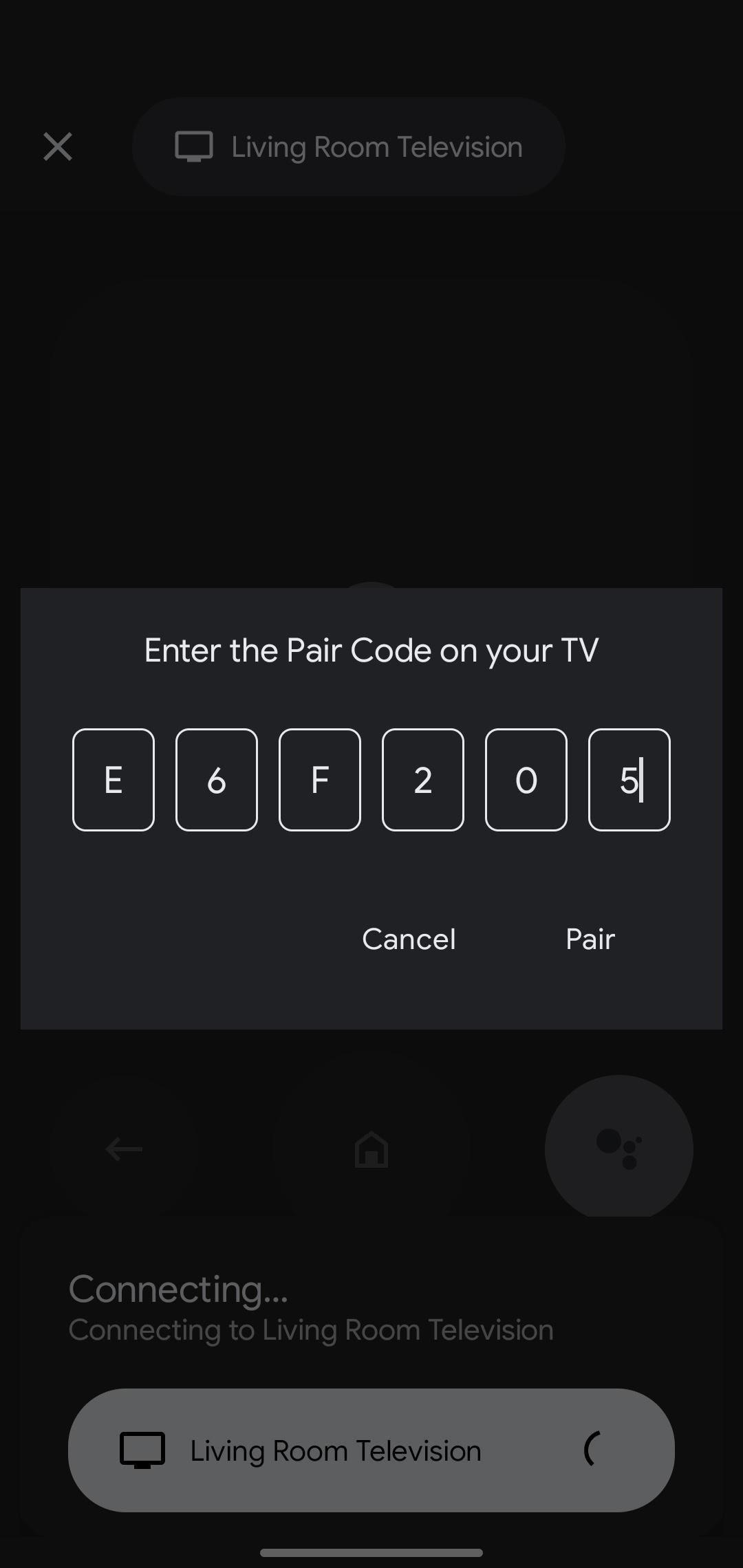 Agora, você precisará vinculá-lo ao seu dispositivo Android TV ou Google TV. Depois que o aplicativo descobrir sua televisão, toque em seu nome para selecioná-la. Por fim, insira o código que aparece na sua TV e toque em”Emparelhar”.