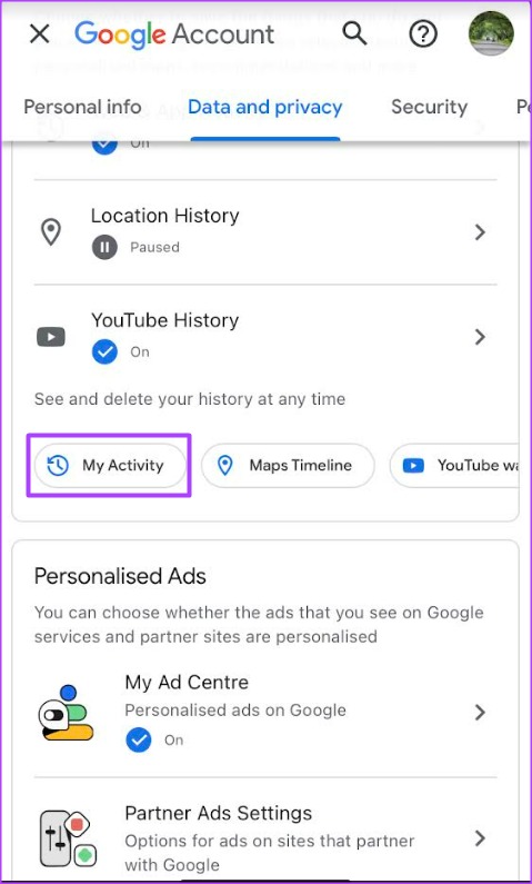 Etapa 5: Role a página para baixo e toque em Minha atividade.