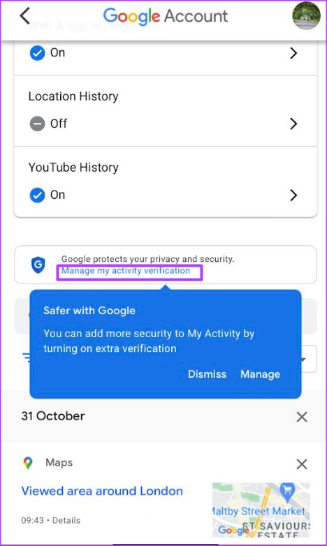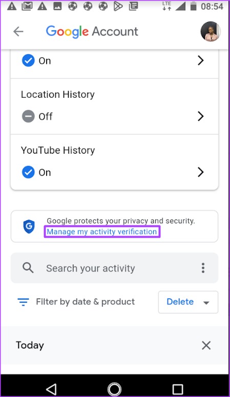 Etapa 6: role a página Minha atividade no Google e toque em”Gerenciar minha verificação de atividade”.