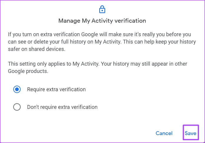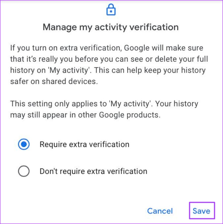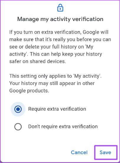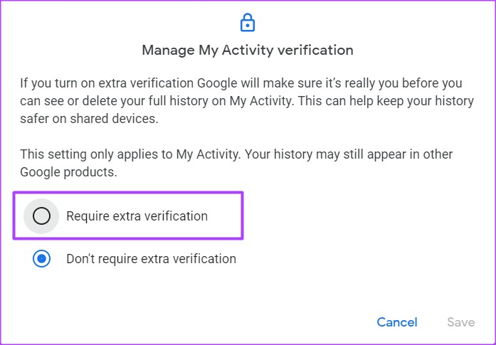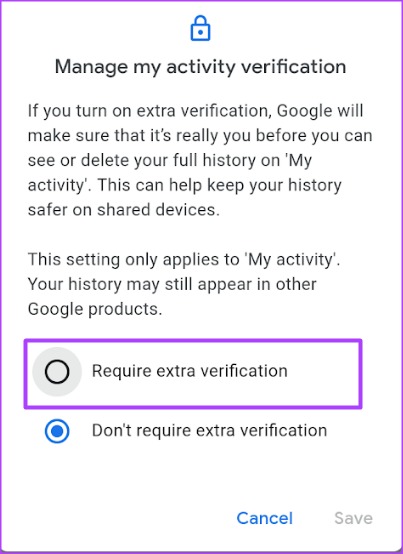 Etapa 3: na página Gerenciar minha atividade janela de diálogo de verificação, selecione’Exigir verificação extra’.