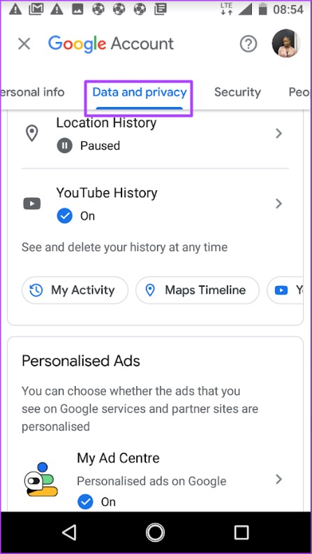 A partir da etapa 3 acima, você pode replicar o mesmo em qualquer Google app em um Android para proteger seu histórico de atividades do Google. Inicie o Google app, toque na imagem do seu perfil e continue a partir da etapa 3.