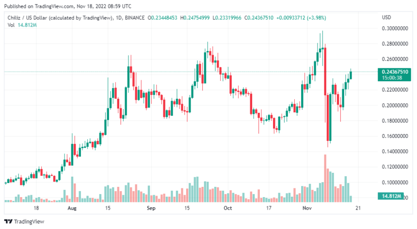 A CHZ continua liderando o mercado em ganhos à medida que aumenta a expectativa em relação à Copa do Mundo. O token de fã go-to foi visto mantendo um lucro intradiário de 7,37%. Atingiu uma alta local de US$ 0,246 durante o dia antes de recuar para seu preço atual de US$ 0,242. Apesar de cair abaixo do piso do dia de negociação, ele se recuperou rapidamente, deixando os traders com lucros substanciais.
