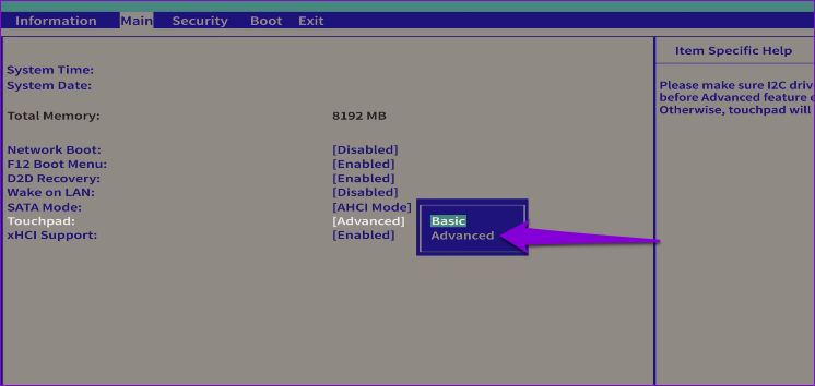 Etapa 8: Quando estiver no BIOS, vá para a guia Principal. Em seguida, use as teclas de seta para navegar até a opção Touchpad, pressione Enter e selecione a opção Avançado.