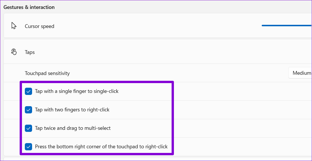 Etapa 4: Na seção Gestos e interação, verifique todas as configurações de gesto e use as caixas de seleção para ativá-los.