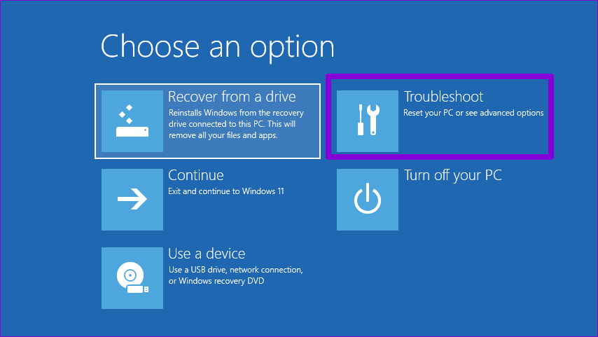 Etapa 1: pressione a tecla Windows + S para abrir o menu de pesquisa. Digite as opções de recuperação na caixa e pressione Enter.