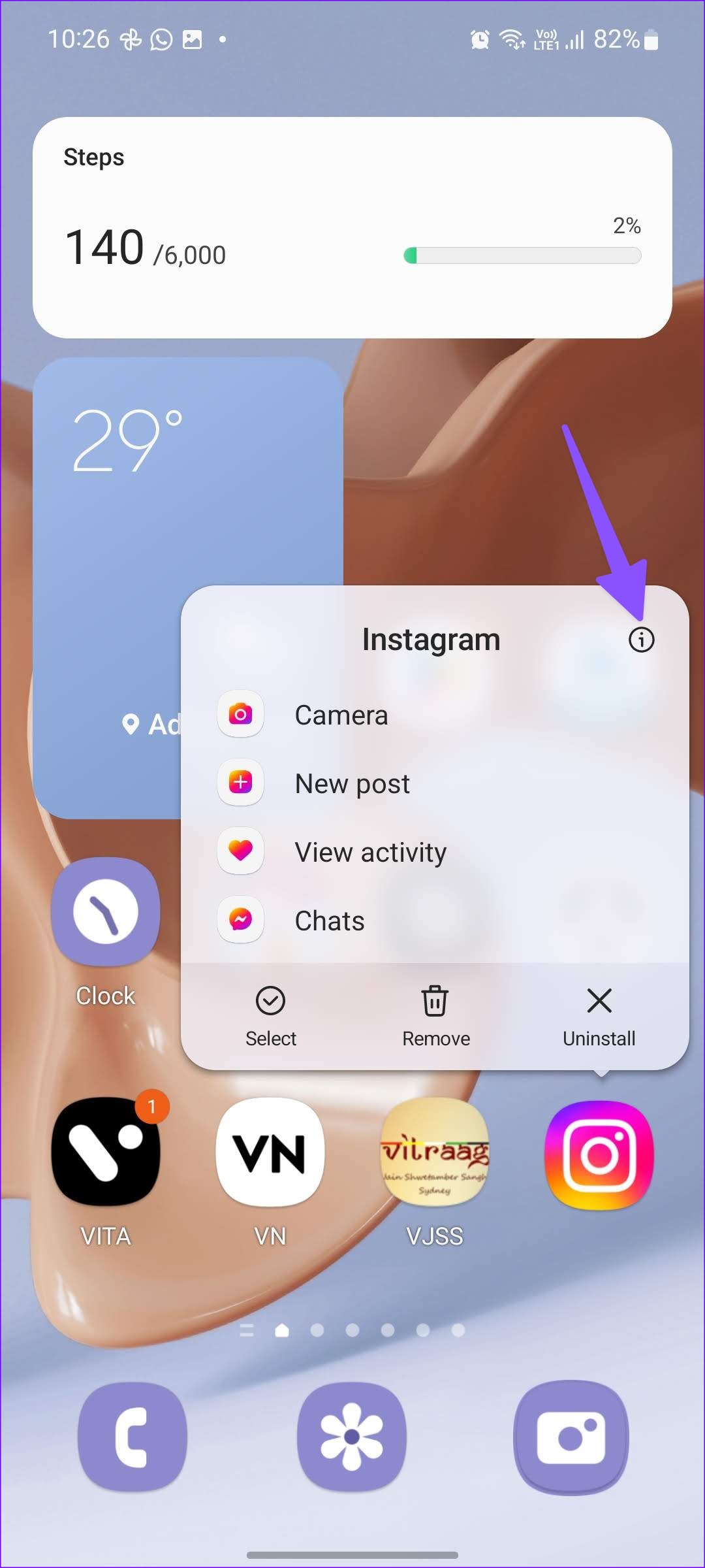 Etapa 1: Pressione e segure em um aplicativo afetado e abra o menu de informações do aplicativo. Por exemplo, abrindo o menu de informações do aplicativo para Instagram.