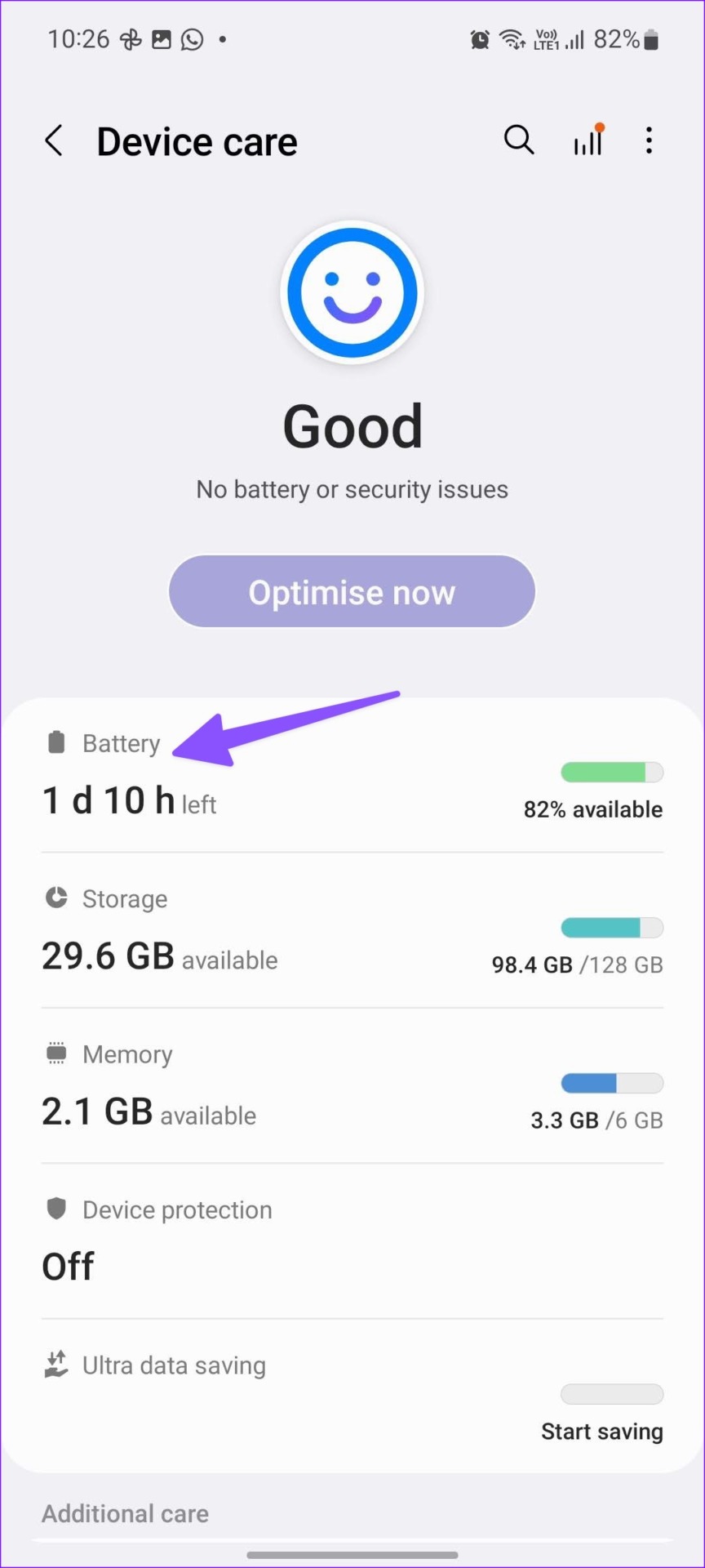 Etapa 1: Abra’Battery and device care’no aplicativo Settings em seu telefone Galaxy (marque as etapas acima).