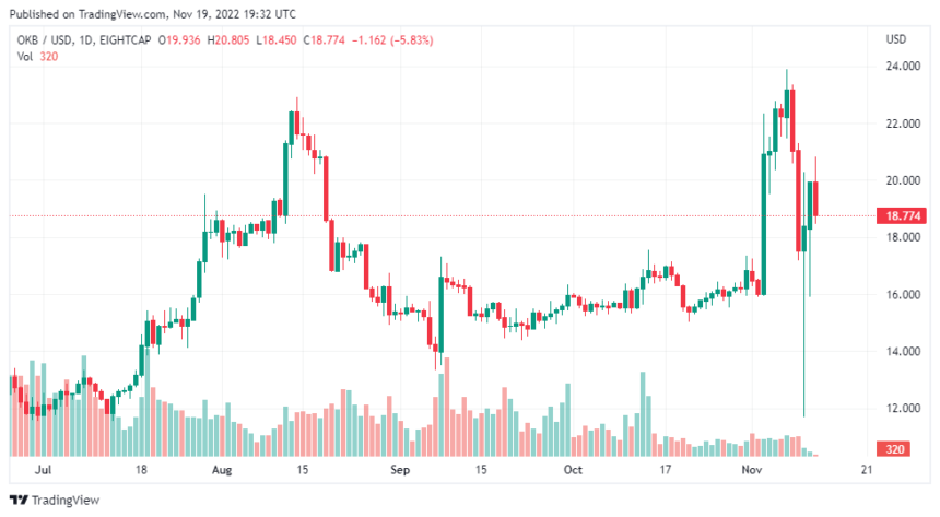 O preço do OKB está sendo negociado atualmente a US$ 18,77. | Fonte: gráfico de preços OKBUSD de TradingView.com