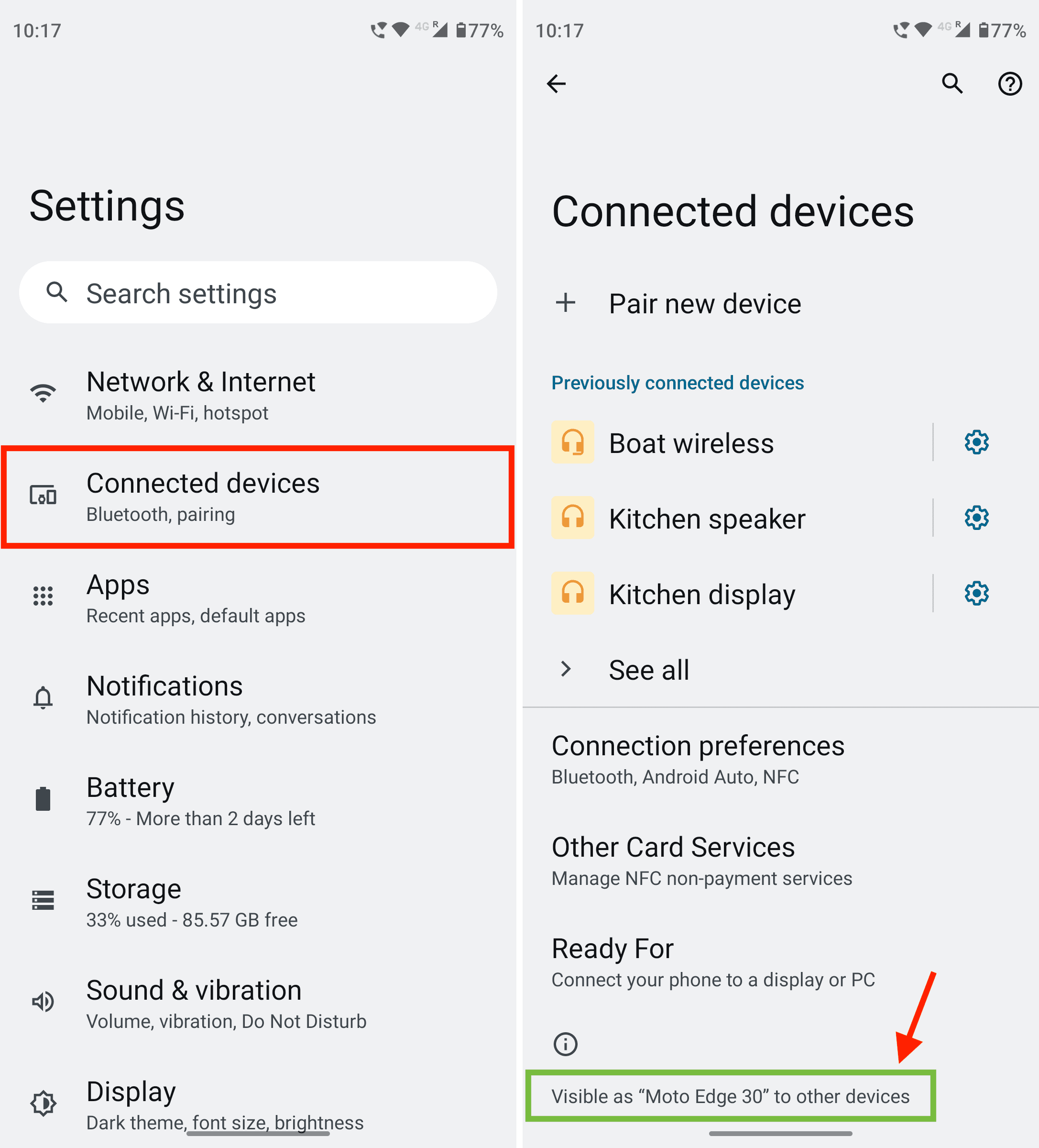 2) No seu telefone Android, vá para o aplicativo Configurações e toque em Dispositivos conectados para acessar suas configurações de Bluetooth. Aqui, você deve ver “Visível como “nome do telefone” para outros dispositivos”. Em caso afirmativo, vá para a etapa 3. Se você não vir essa linha, ative a visibilidade do Bluetooth do seu telefone. Você deve conseguir fazer isso tocando em Emparelhar novo dispositivo.