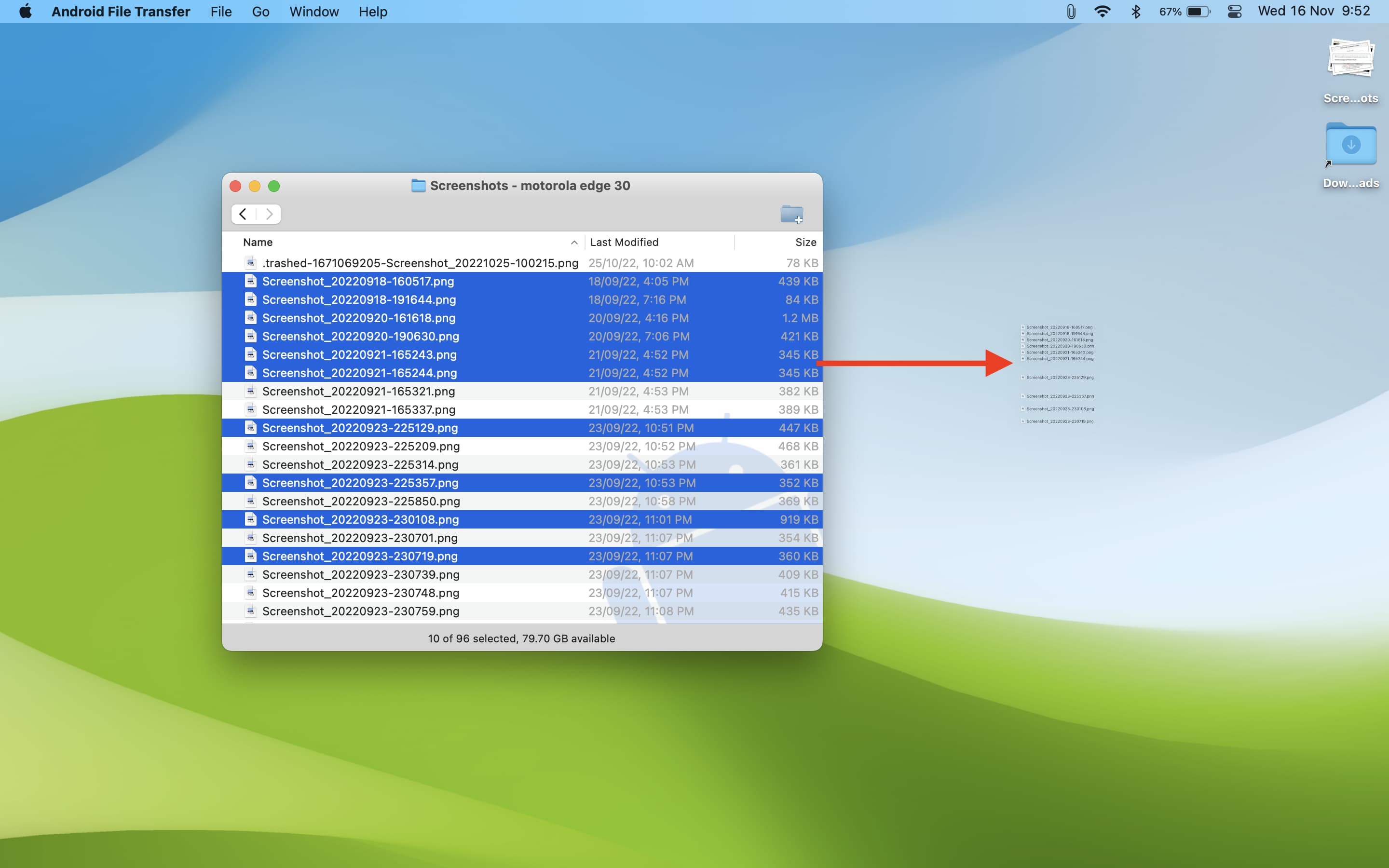 Selecione os arquivos ou pastas dentro do aplicativo Android File Transfer e arraste-os para a área de trabalho ou pasta do seu Mac. Para selecionar vários arquivos, segure a tecla Command e faça sua seleção.