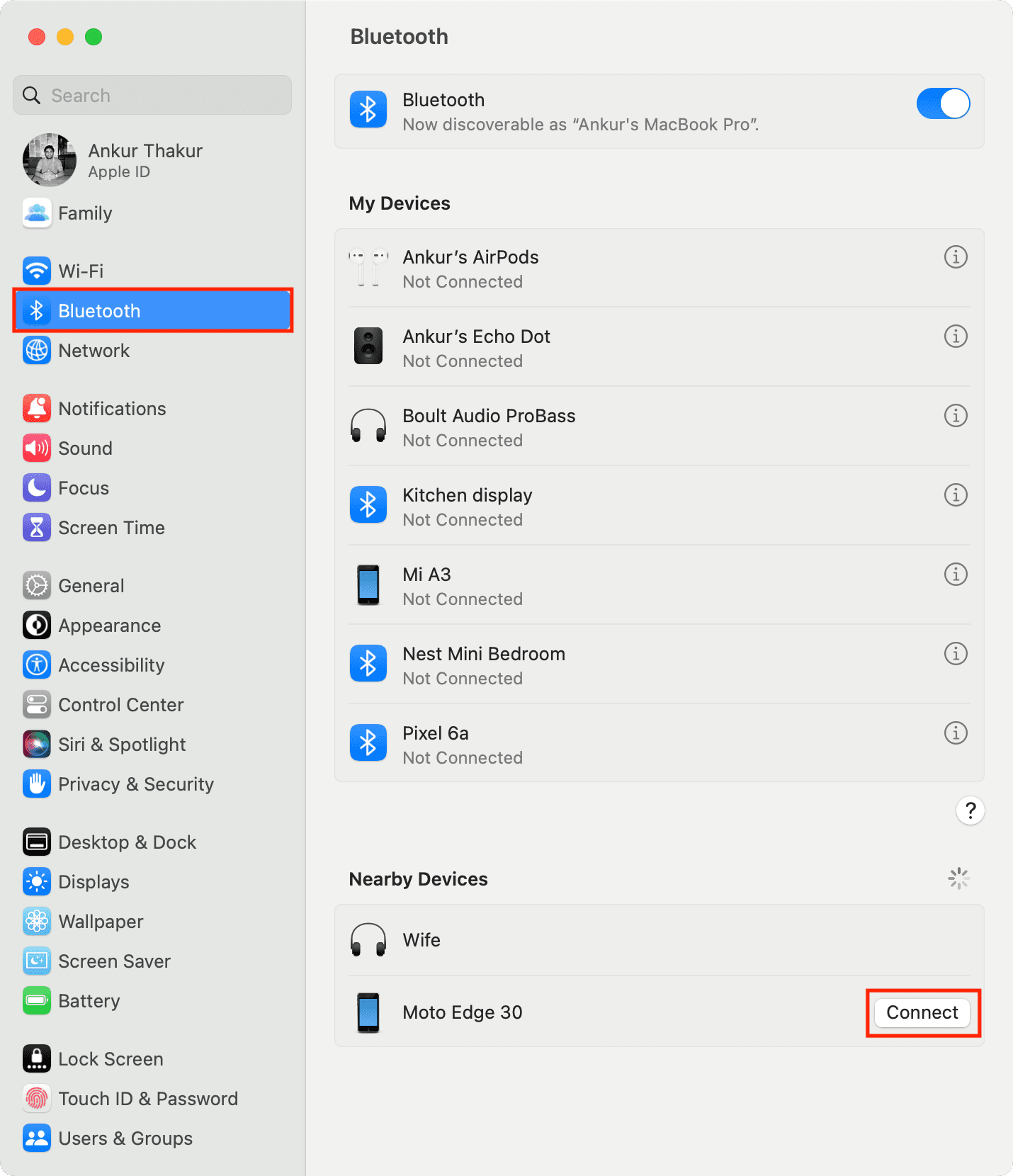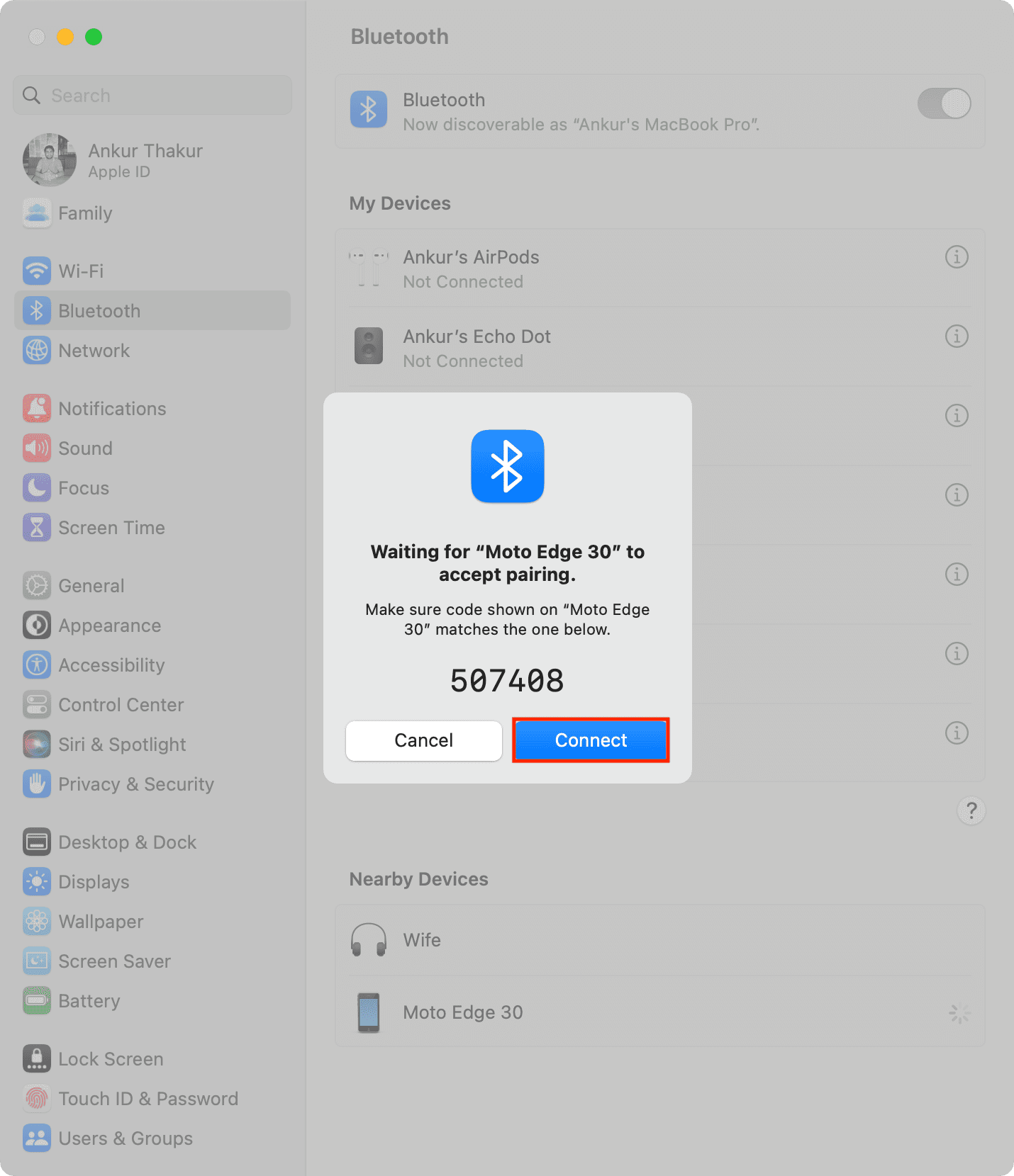 3) Volte para as Configurações do sistema no seu Mac. Você verá seu telefone Android em Dispositivos próximos. Passe o ponteiro sobre ele e clique em Conectar.
