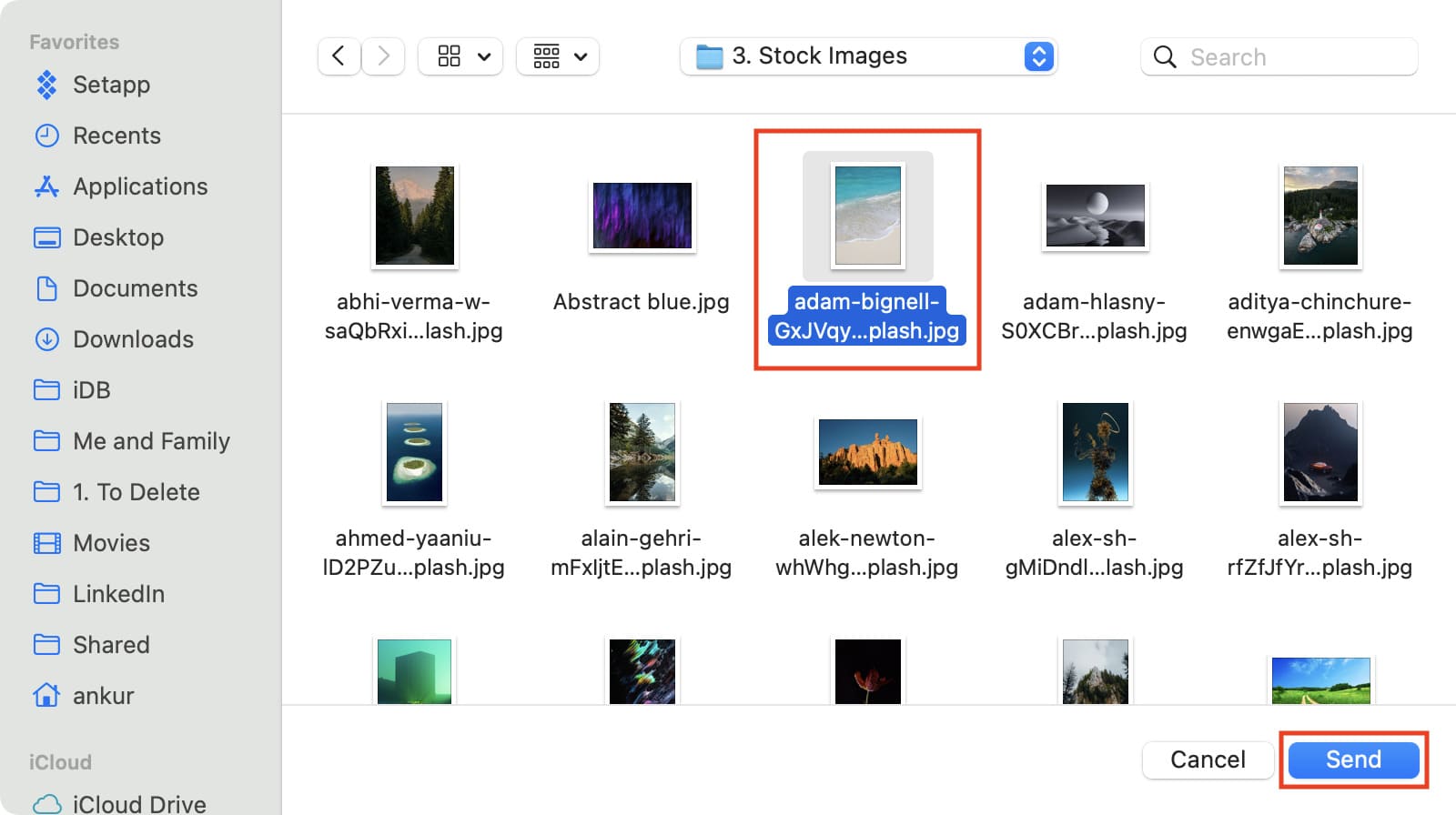 Selecione as fotos, vídeos, áudio, documentos, etc., do lado esquerdo e solte-os do lado direito, ou seja, do lado do Android. Para selecionar todos os arquivos visíveis, use Command + A ou clique na pequena caixa quadrada no canto superior esquerdo.